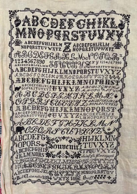 Custom-made and creative. June Lane from New Zealand took "Gertrud Gröschel 1895" and created a gorgeous sampler in memory of her grandmother Gertrude. "Introducing my grandmother, Gertrude. Wood carver, pianist, singer, choir mistress. Knitter and also crocheted. She also always had a budgie. Music on the right, craft on the left with a budgie. Dark blue letters are for my Grandmother, her mother, my daughter, my 4 granddaughters and the light blue for my mother (her daughter-in-law) and my daughter-in-law." Adorable! Quite surprisingly, I received a photo of Akemi Ninomiya from Japan in an email today. Her “Grete Rathmans 1788/89” is fascinating. Thank you so much for sharing!