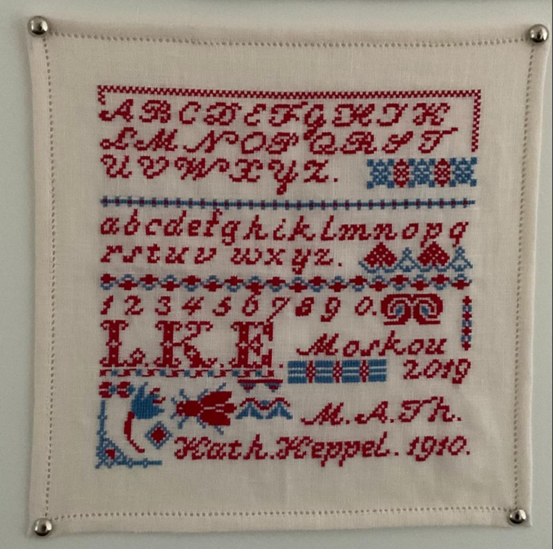 Fiona Kyle wrote on Instagram about her "Antoinette 1894-1896": "I started her on Jan 1 2024 with the goal of doing a letter a day (or more) to get her done by the end of the year. That came and went and I finished her on Nov 13 2025. She’s stitched in @silks4u PR070. She will get her frame next year but for now she’s hanging in my sewing room to enjoy. Loved this stitch, she’s just beautiful. But I might be alphabetted out for now!" Very, very beautiful! Marian from the Netherlands also commented on the photo of her "Kath. Keppel 1910" there: "A small sampler I stitched in 2019 during a visit to Russia. Hard to believe now that we spent our holiday there." Gorgeous! Thank you both so much for sharing!